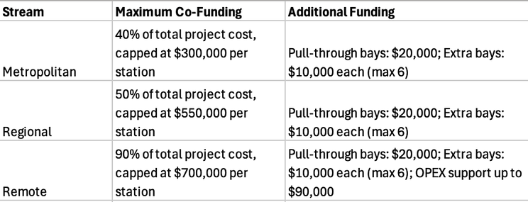 Funded sites must be publicly accessible and strategically located to ensure charging stations are no more than 100 km apart along major roads and highways.